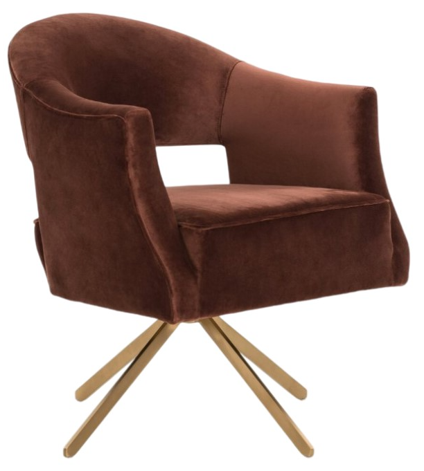 A Seventies form gets a modern refresh. Velvety auburn upholstery shapes comfortable curves, lightened up with a posterior cutout. Polished brass legs taper at a slant for retro effect. A 360-degree swivel base brings ease to the modern office.Read More