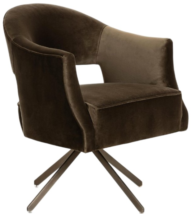 A Seventies form gets a modern refresh. Velvety olive upholstery shapes comfortable curves, lightened up with a posterior cutout. Polished brass legs taper at a slant for retro effect. A 360-degree swivel base brings ease to the modern office.Read More