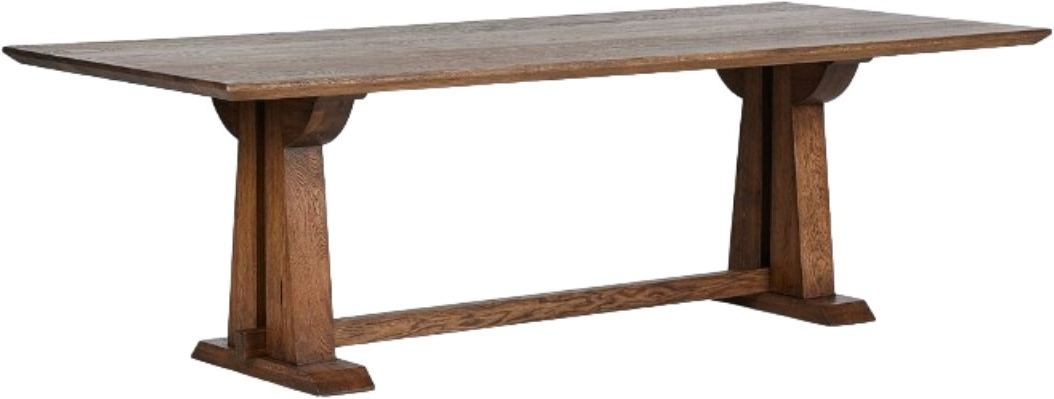 A trestle-style table of brown-finished solid oak brings a traditional look to modern speed.