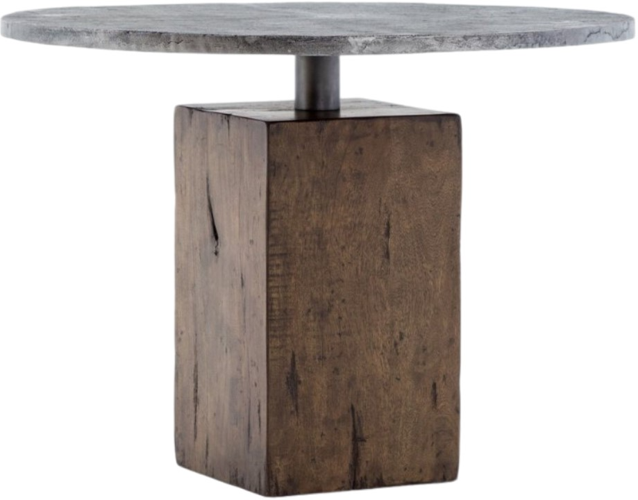 Shape and texture blend for instantaneous impact. A rectangular slab of weathered reclaimed woods provide a solid base to offset a slender aluminum neck before dramatically brimming into a round tabletop. Light gunmetal finish reveals industrial texture and metallic edge.Read More