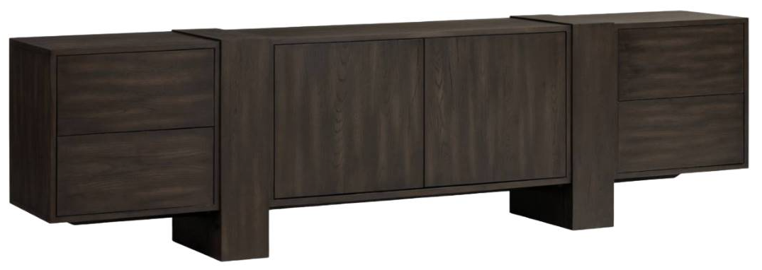 Crafted from a mix of solid oak and smoked black veneer, the contemporary shaping of this grand-scale media console lets the natural graining, cracking and character of the woods take center stage. Designed with oversized legs and cantilevered doors, with push latch doors.Read More