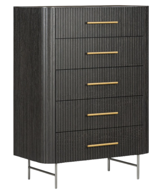 Rich with reeding for great texture and a linear look, distressed black-finished solid oak flaunts five roomy drawers with gunmetal-brushed hardware and curved corners, while a bluestone top brings a beautifully complementary material mix to bedroom storage.Read More