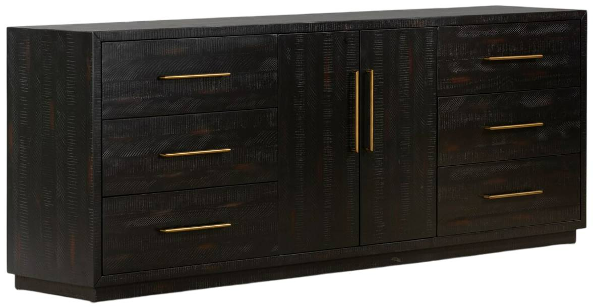 A hand-rubbed, burnished black finish draws the eye with high-low contrasts to modernize a mid-century shape. Brass-finished hardware adds a sleek touch to console's six spacious drawers and open-front cabinetry.Read More