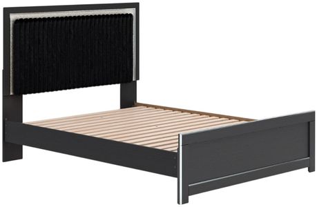 Includes upholstered panel headboard, panel footboard, platform rails and roll slats