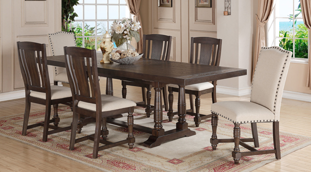 Gorgeous limed Gray or Espresso finishes enhance the contrasted oak wood grain of these grand tables. Mix and match upholstered and slat back chairs for an eclectic look.